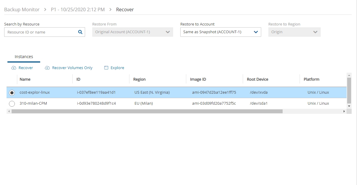 In the Recover screen, you can see all the instances that this backup contains. Should this policy include also EBS volumes, RDS databases, Redshift Clusters, or DynamoDB Tables, you will have a tab to recover them as well. In order to recover an instance, select the Instances tab.