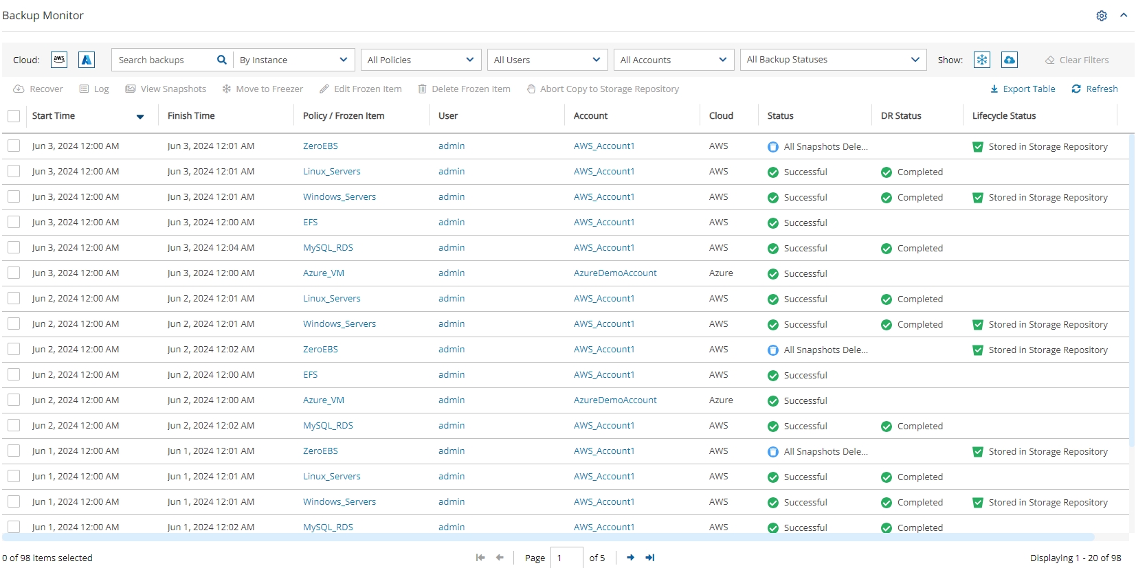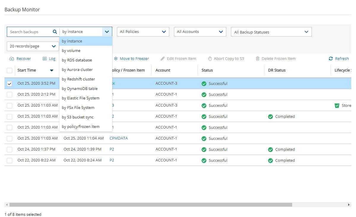You can view the backups in the Backup Monitor tab. You can search for snapshots based on the Backup Target type, Policy, Account, and backup status.