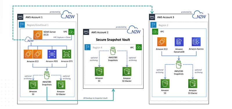 Disaster Recovery (DR) - In the case of Disaster Recovery, N2W protects resources running on AWS Outposts and copies data to another AWS Region or AWS account.