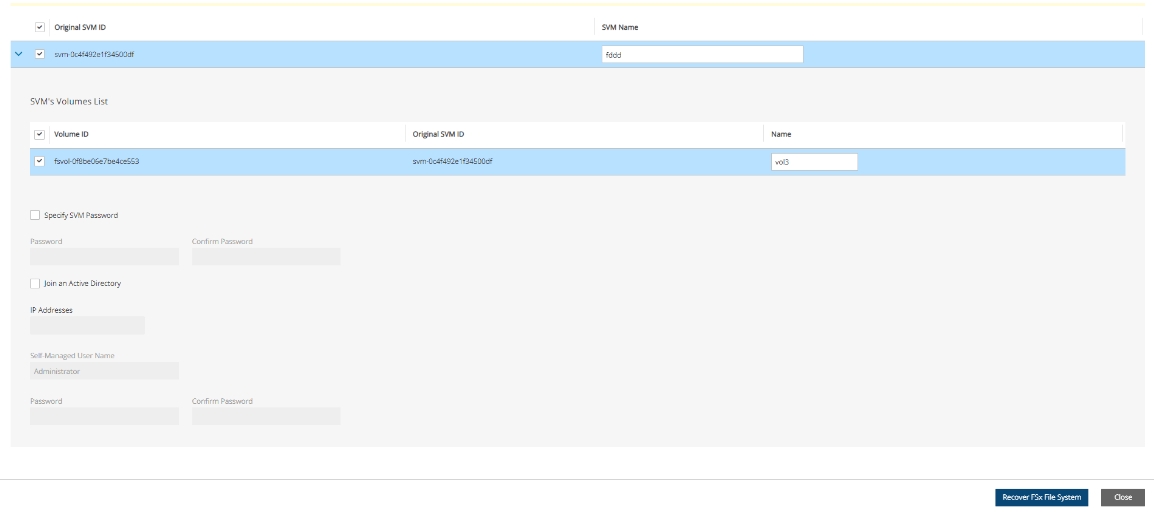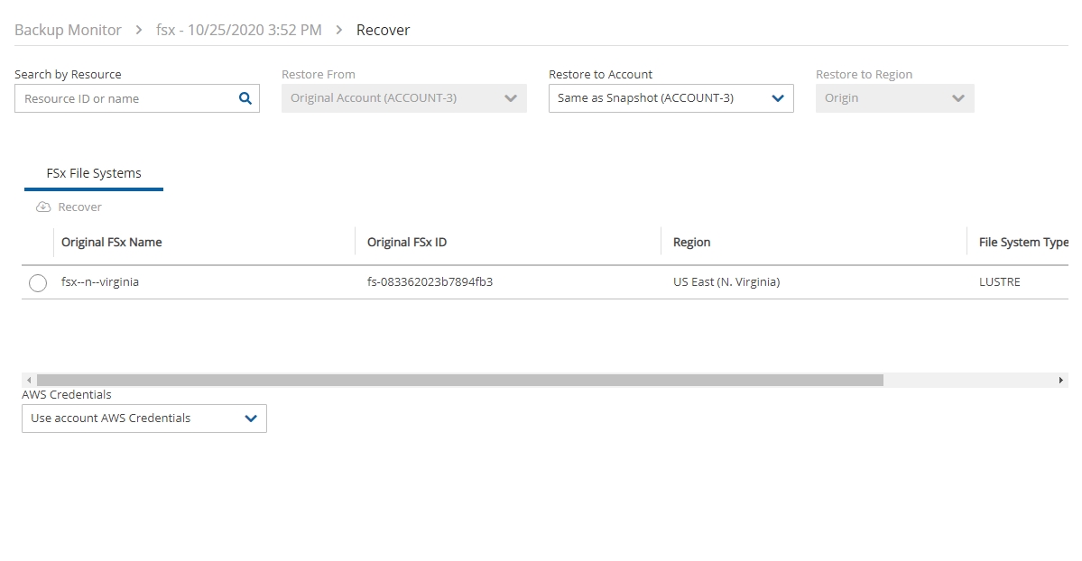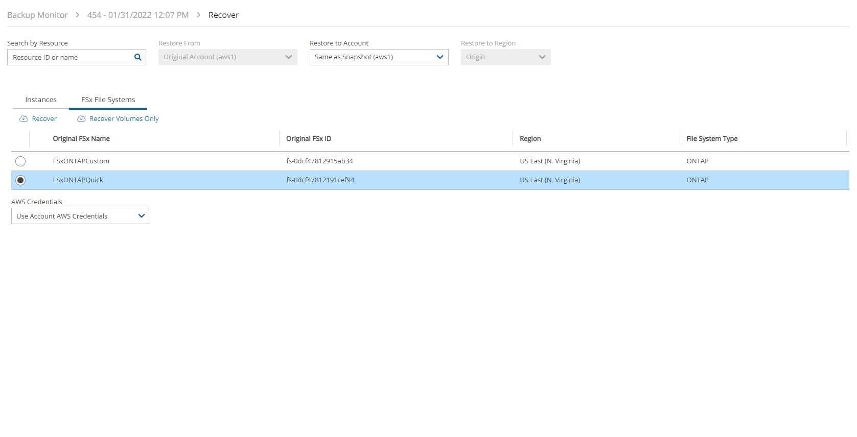 Recover. The FSx File Systems tab will show the Original FSx Name and ID, Region, and File System Type.Select the ONTAP file system to recover and then select
