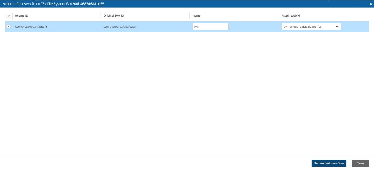 3. In the Volume Recovery from FSx File System screen, select the volumes to recover. For each volume, type the Name of the volume and select the SVM to attach the volume to.