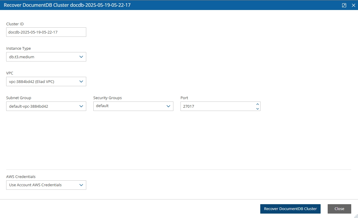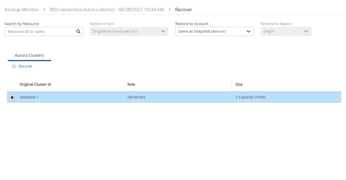 If you defined cross-account DR for this policy, you will have the Restore from Account list for choosing from which account to perform recovery.