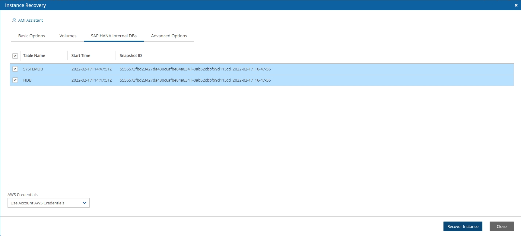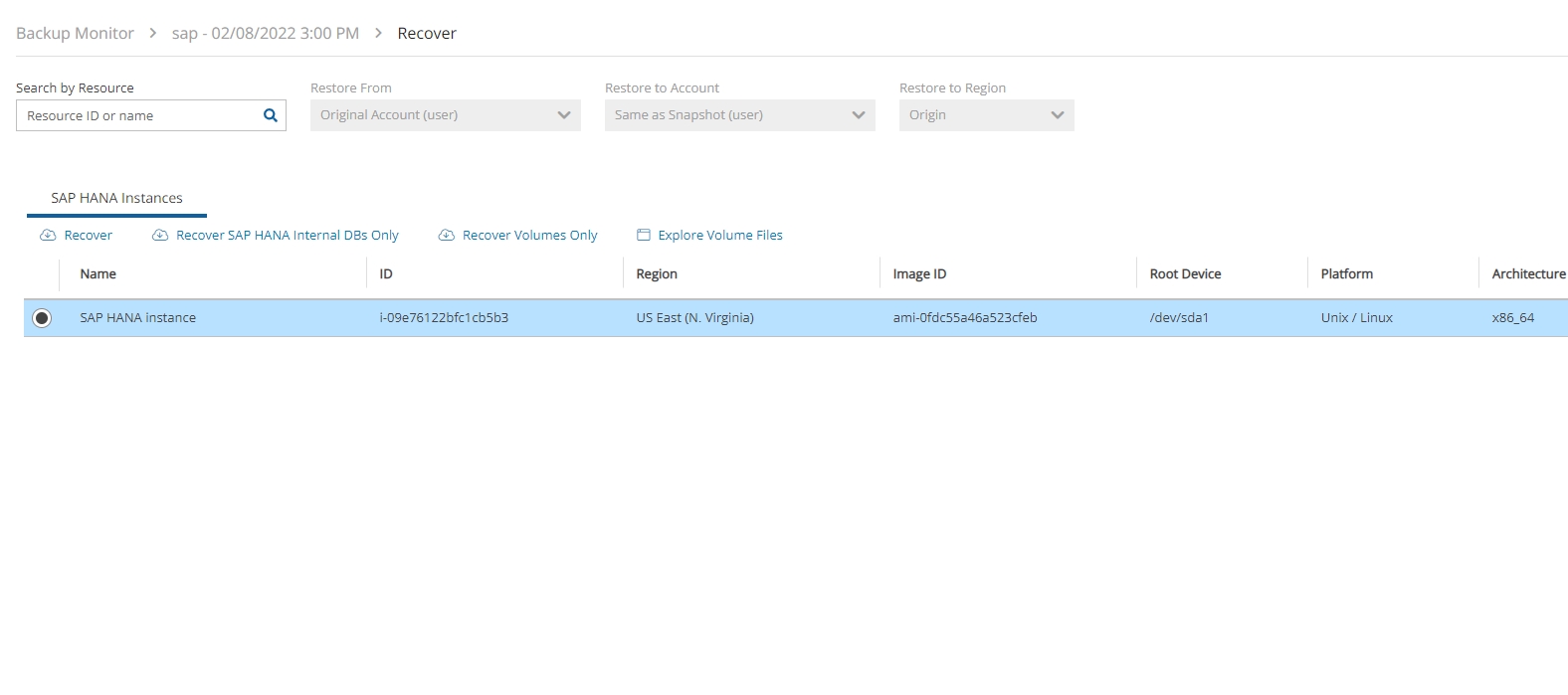 Recover – EC2 instance recovery with SAP HANA native recovery performed on a newly recovered instance. Cross–region recovery is supported when selecting another region in the Restore to Region list.