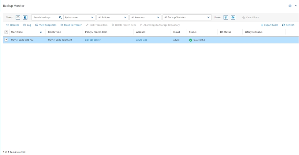In the Backup Monitor, you can search for snapshots based on the Backup Target type or policy, including frozen images.