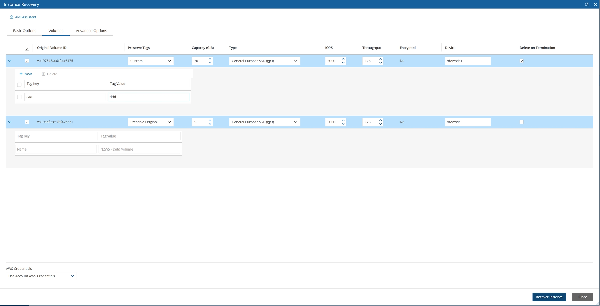 All recovery screens have a drop-down list at the bottom labelled AWS Credentials. By default, the account AWS credentials used for backup are also used for recovery operations. Depending on the backup, you can select Provide Alternate AWS Credentials and fill in different credentials for recovery. This can be useful if you want to use IAM-created backup credentials that do not have permissions for recovery. See section 16.3. When using custom credentials, N2W verifies that these credentials belong to the recovery account.