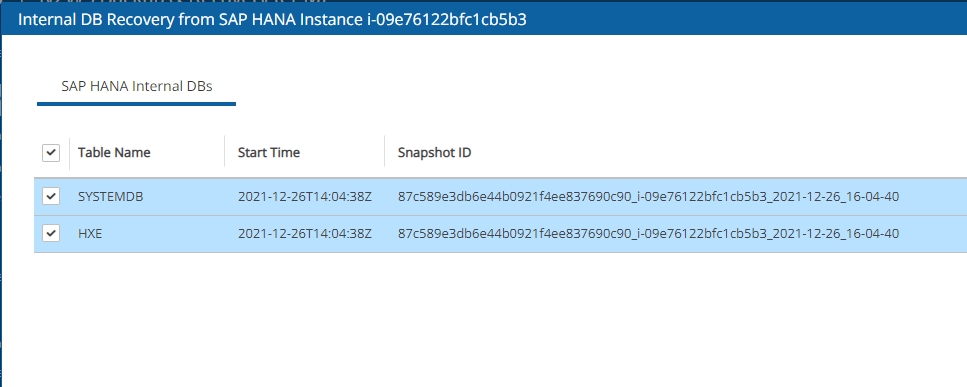 5. If Recover SAP HANA Internal DBs Only is selected, select the internal DBs for recovery, and then select Recover Instance.