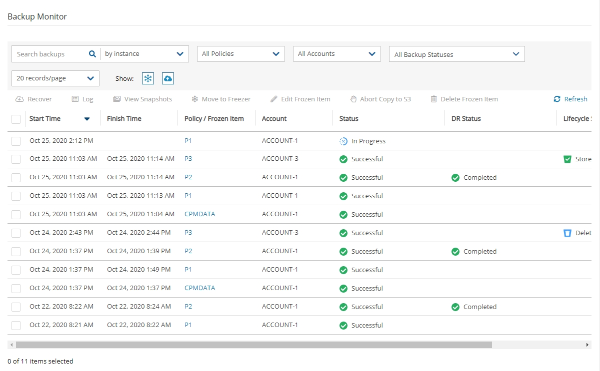 cpmdatapolicy by filtering snapshots with the stringcpmdata. N2W always adds the policy name to any snapshot’s description.Sort by Started in descending order and it will be the first one on the list.