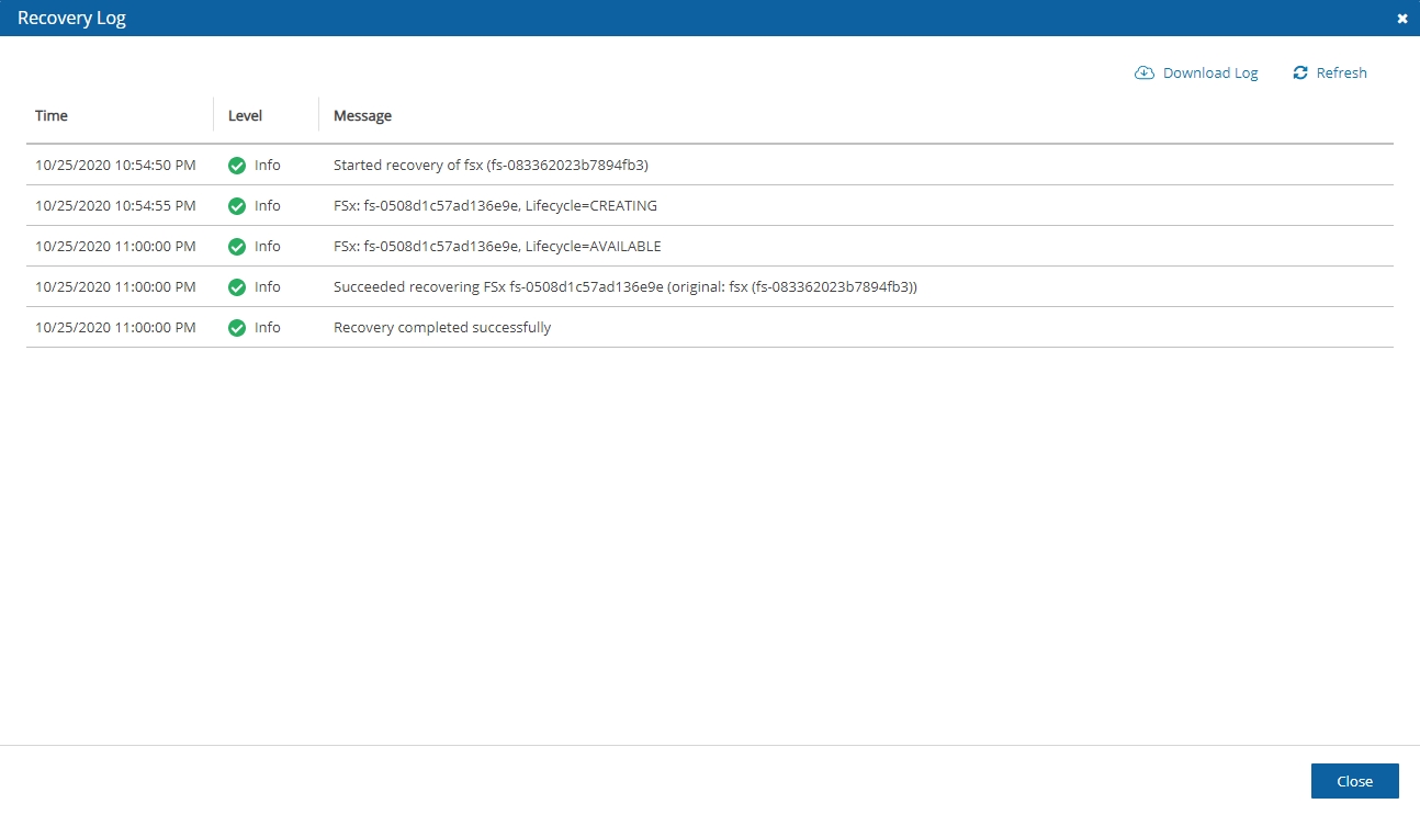 Log screen where every stage and operation during DR is recorded: