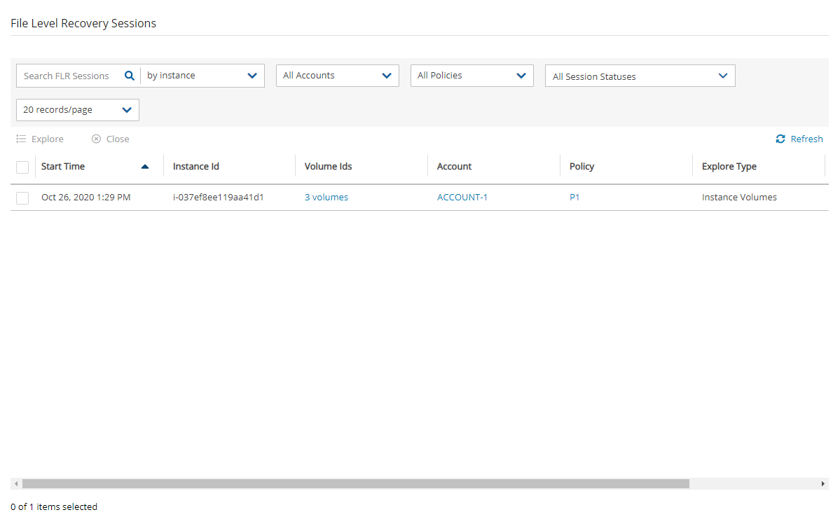 Select Open Session for an Explorer-like view of the entire instance or a specific volume, folder, or file. Loading the session may take a few minutes. If the Initializing File Level Recovery message closes before you can select Open Session, in the left pane, select the File Level Recovery Sessions tab, select the active session, and then select
