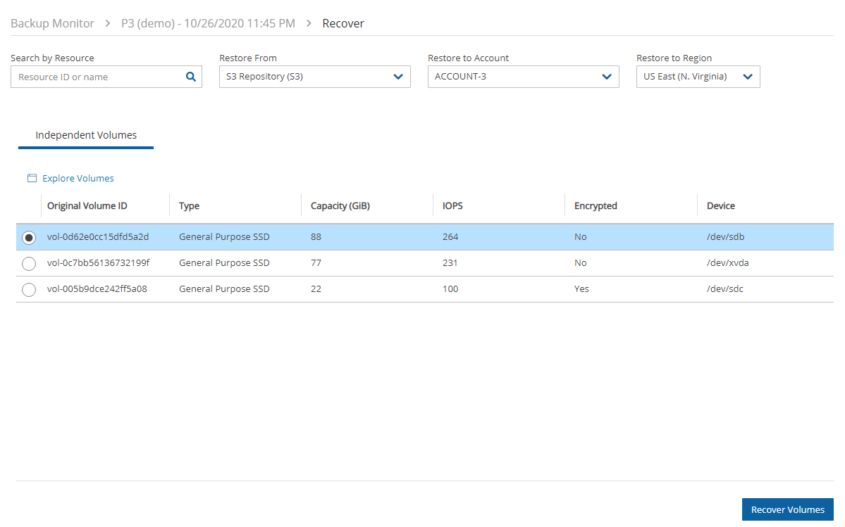 Recover Volumes Only, select the required volume, and then select