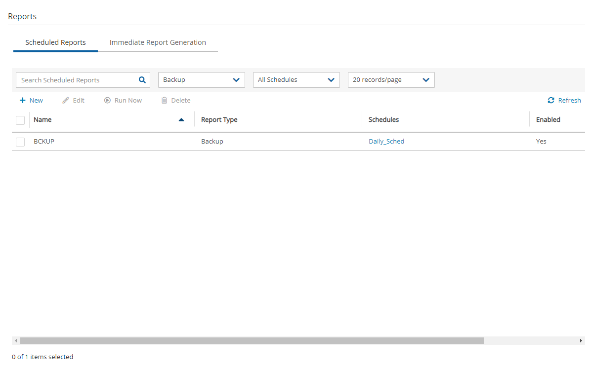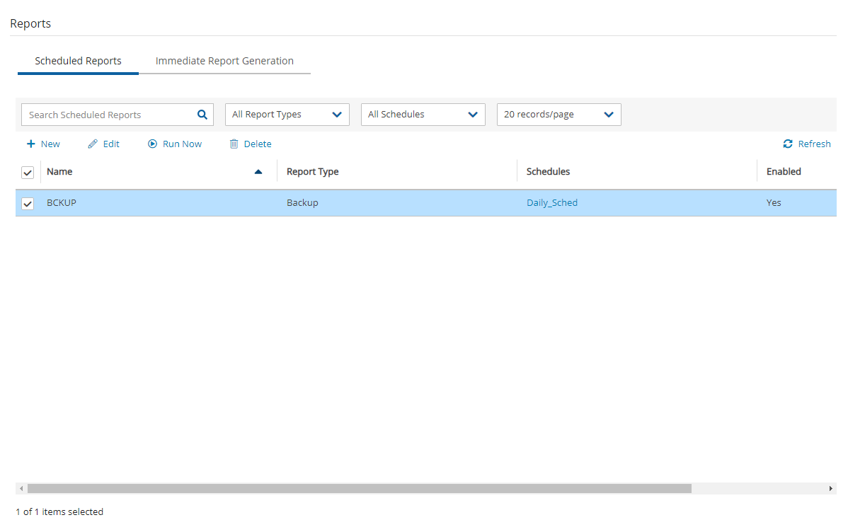 In the Scheduled Reports tab, Run Now generates a defined Scheduled Report and sends emails to its recipients.