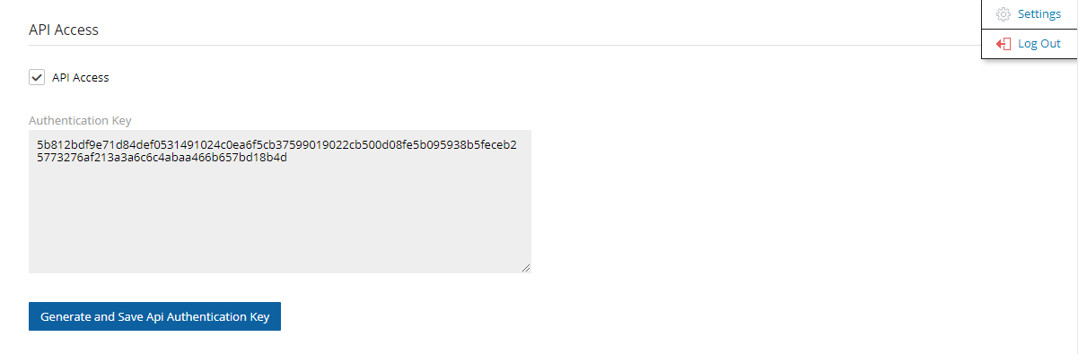 To generate a new Authentication Key and invalidate the current, select Generate API Authentication Key.