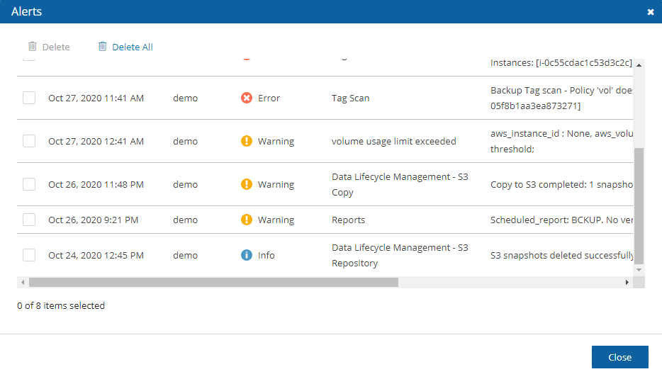 Later, when the policy succeeds, the alert is turned off or deleted, so you will know that the issue is resolved. Alerts can be issued for failures in backup and DR, as well as general system issues like license expiration, for relevant installations.