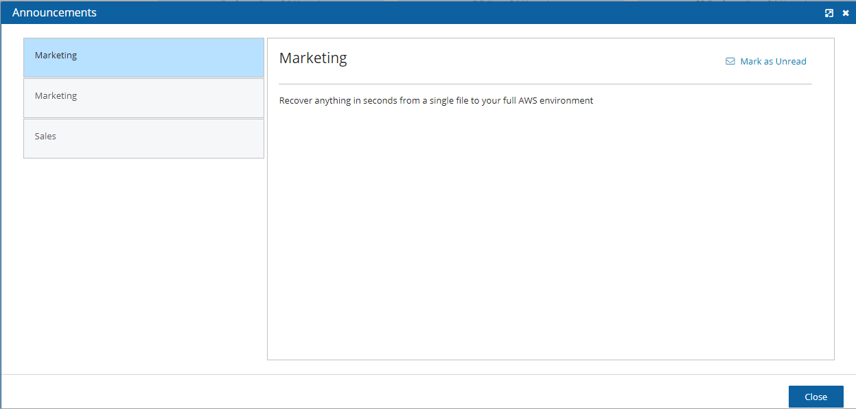 Announcements are a method for N2W to communicate directly to users about non-operational topics, such as promotions and other sales-related information.