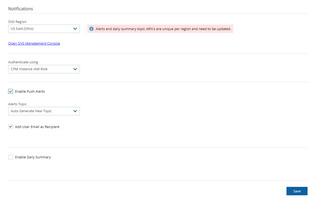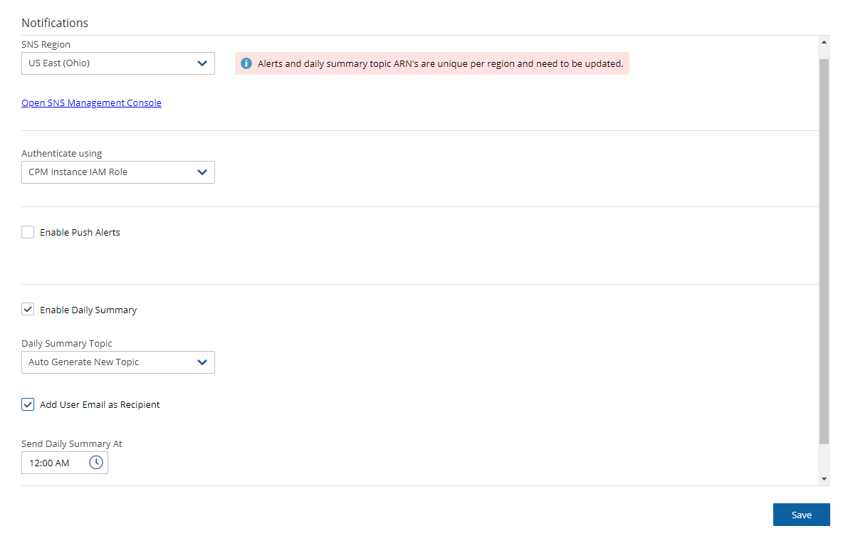 SNS credentials are not tied to any of the backed-up AWS accounts. You can choose a region, and enter credentials, which can be regular credentials, IAM user. See section 16.3. To use the N2W Server instance’s IAM role (only for the root user), type