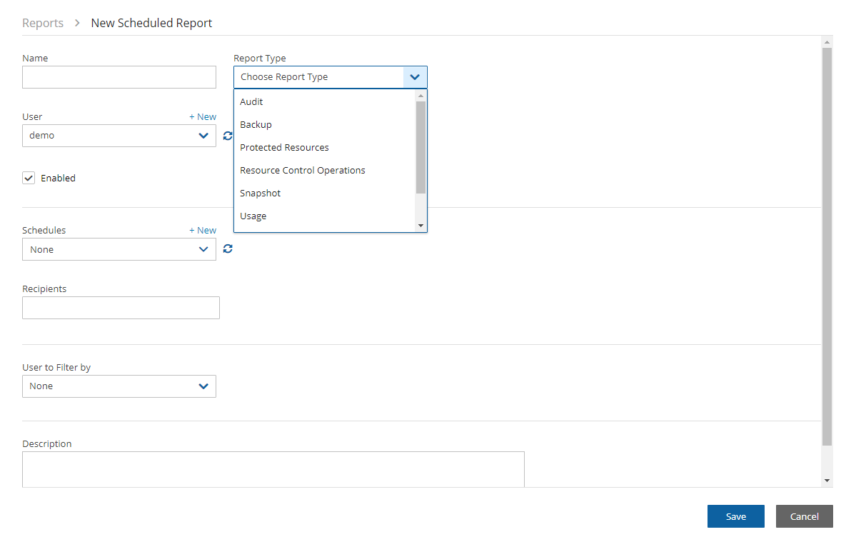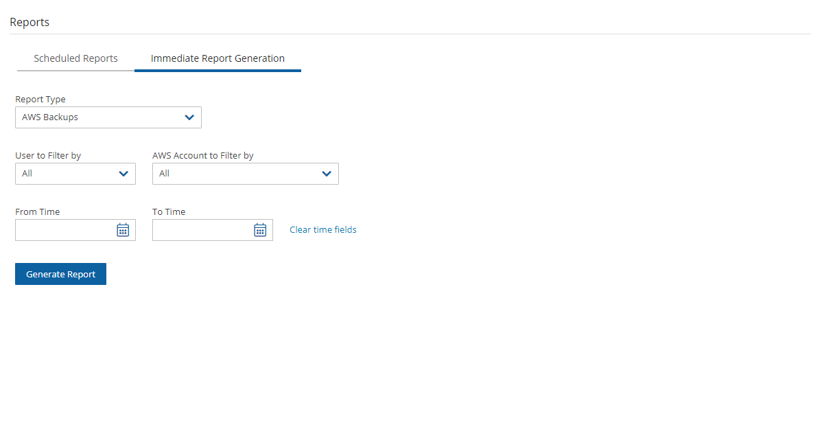 The AWS unprotected resources report is available as a Scheduled Report only and contains information about the AWS resources that do not have backup policies.