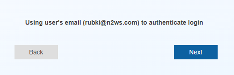 1\.      After choosing **Email**, a notification specifying the user’s registered email for the tokens opens. If the email address is correct, select **Next**. N2W will attempt to send email to the address shown.