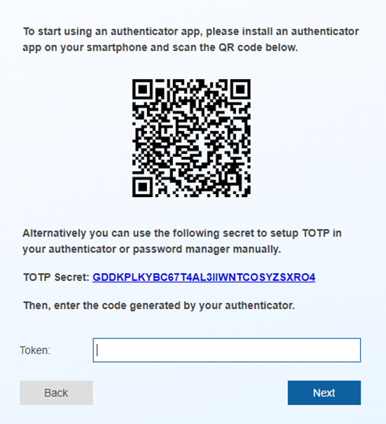 2. On your device, open the authenticator app and choose to add a new device by scanning the displayed QR code or by entering the displayed TOTP secret code if the camera or scanner is not available.
