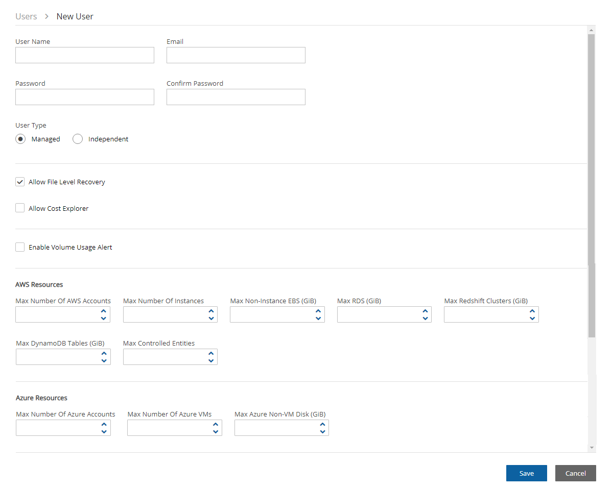 For Users that will have Azure accounts, in the Azure Resources section, select the value for the respective resource limitations for Max Number of Azure Account, Max Number of Azure VMs, and Max Azure Non-VM Disk (GiB).