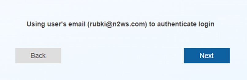 1. After choosing Email, a notification specifying the user’s registered email for the tokens opens. If the email address is correct, select Next. N2W will attempt to send email to the address shown.