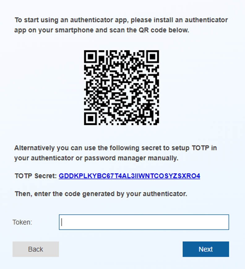 On your device, open the authenticator app and choose to add a new device by scanning the displayed QR code or by entering the displayed TOTP secret code if the camera or scanner is not available.