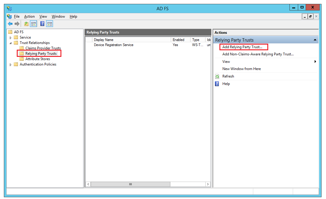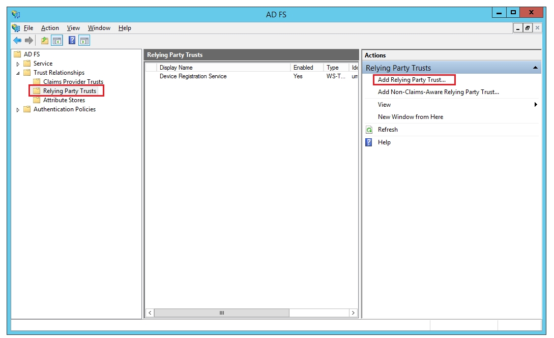 In the main page of the management console, in the left pane, select Relying Party Trusts.