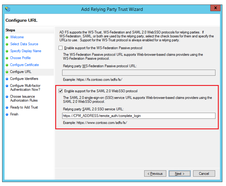 In the Entity ID box, type the AD FS Federation Service Identifier, as configured in AD FS. See section 19.5.1 to locate this parameter in AD FS.