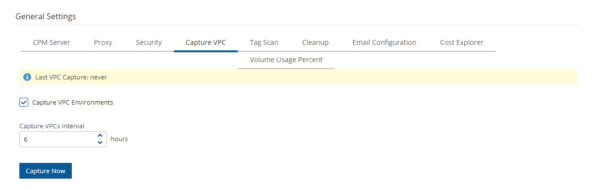 Once enabled from **General Settings**, N2W will automatically capture network environment settings at pre-defined intervals, such as for cleanup and tag scanning. The root/admin user can enable the feature in the **Capture Network Environments** tab of the **General Settings** screen and set the interval of captures. Capture settings are enabled at the account level, by default, same as tag scanning.