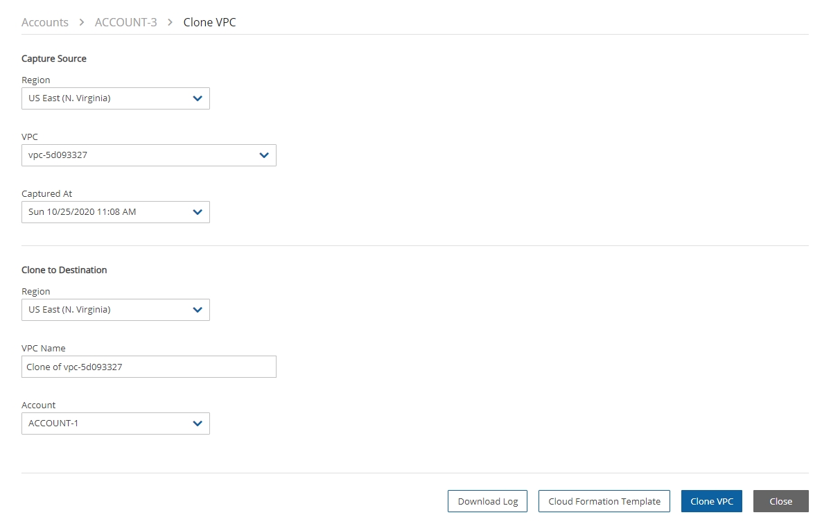 During instance recovery and DR, clones may be optionally created to replicate a particular VPC environment before the actual instance recovery proceeds. The new instance will have the environment of the cloned VPC and will subsequently appear at the top of the target region and account list. A typical scenario might be to capture the VPC, clone the VPC for the first instance, and then apply the cloned VPC to additional instances in the region/account.