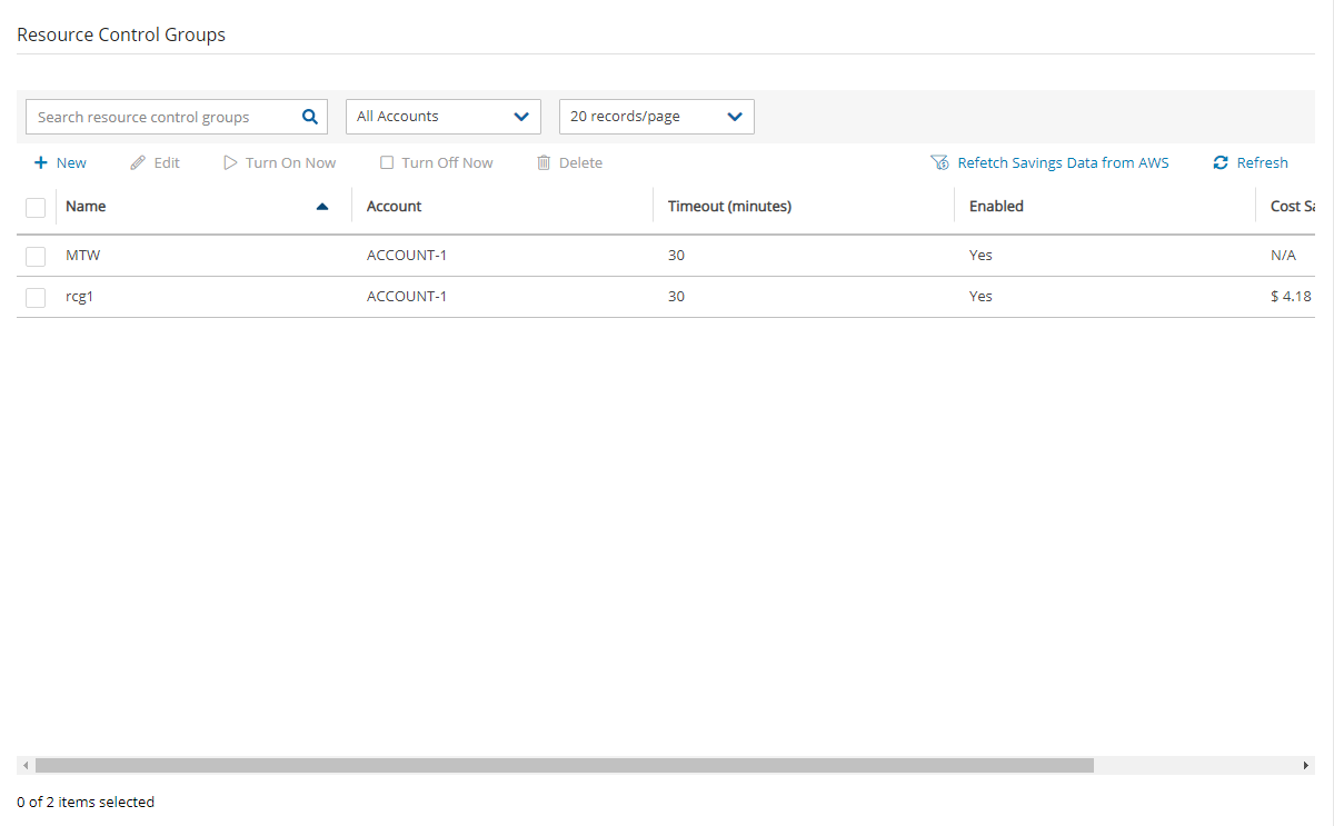 In the Resource Control Groups tab, you can monitor the expected Cost Savings for each group, based on the schedules you have set to Turn Off an instance or an RDS database.
