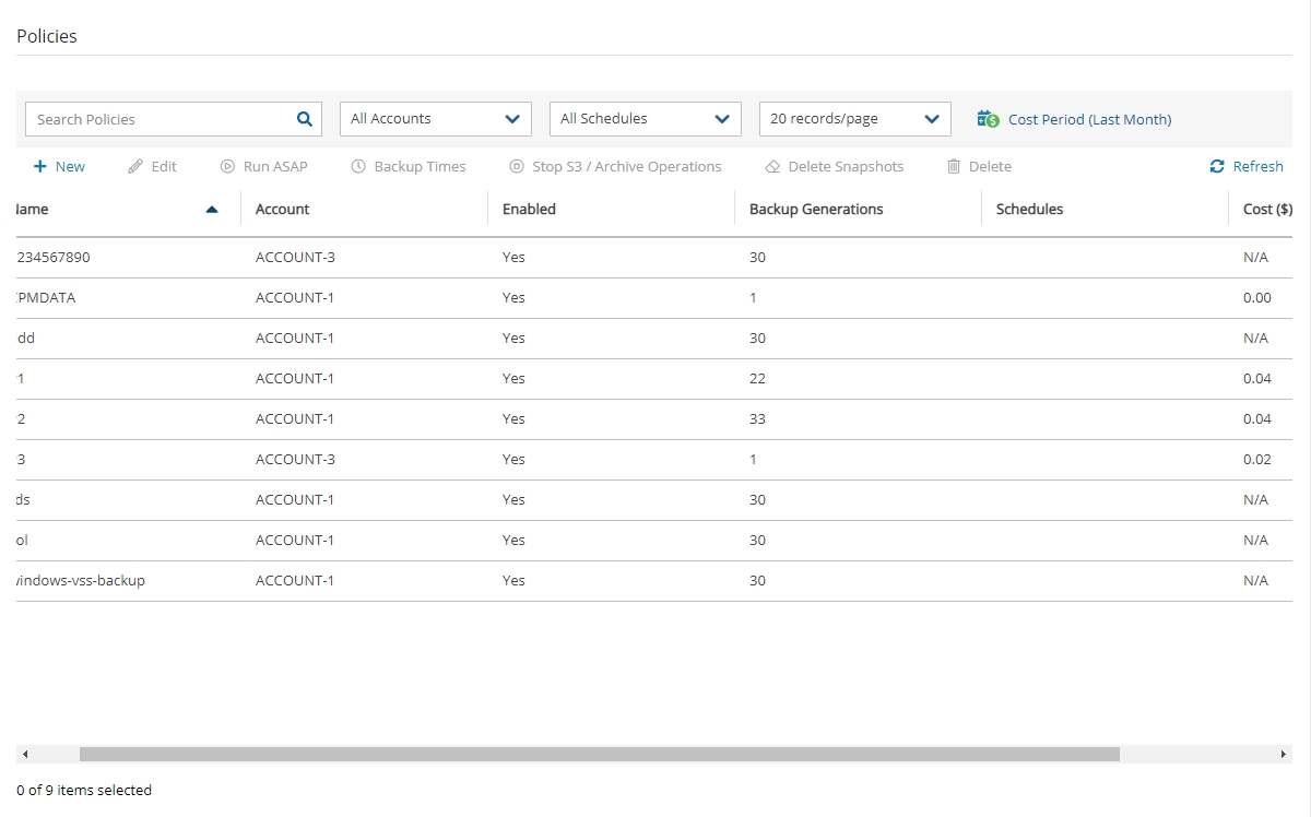 In the Policies tab, you can monitor the backup costs of each policy for the last month or a different time period. The breakdown of costs per policy in dollars for the desired period appears in the Cost ($) column.