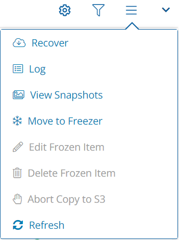 |            <img src="https://content.gitbook.com/content/5oB64hgFIX2jdQ2O72cF/blobs/eaJNsymxvNKaCgAZXdc1/Moved%20to%20S3%20symbol.png" alt="" data-size="line">           | Moved to S3                               | <img src="https://content.gitbook.com/content/5oB64hgFIX2jdQ2O72cF/blobs/VezUOUWjsYzVcW32JJwb/Show%20log%20icon.png" alt="" data-size="line">**Show Imported Snapshots**                                                                                                                                                                                                                         |