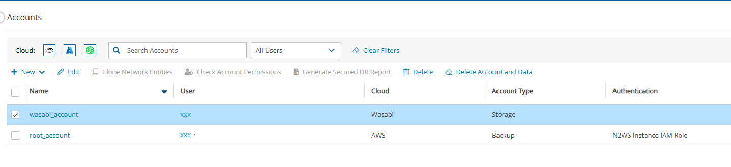 * With Wasabi accounts, you will be able to create a Storage type account. See section [27](https://docs.n2ws.com/user-guide/27-using-wasabi-storage).