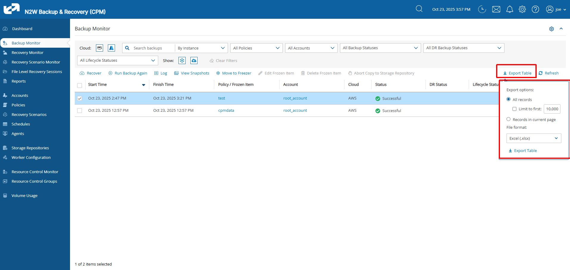 For any displayed table in N2W, you can export all records, some records, or only the table records on the current page, by selecting **Export Table** on the right side of the action toolbar.&#x20;
