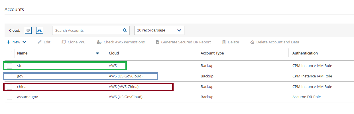 If the account that you are about to create will be operating with non-standard AWS regions, such as China or US government clouds, it is necessary to first contact N2W Support (see section 3.6) to adjust the N2W configuration. After N2W Support has made the adjustment, when you create the N2W account, you will be prompted for the AWS Cloud Type.