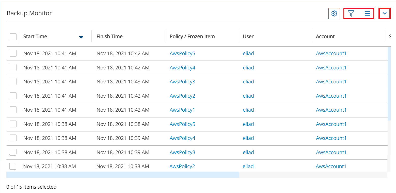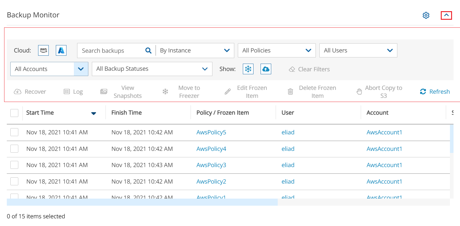 Toolbar and filter bar minimization extends the display of tables in list views. The up arrow minimization button (marked in red) is in the top-right corner of the view. Selecting the up arrow hides the bars shown within the thin red outline.