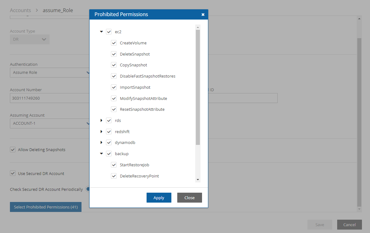 Enable Use Secured DR Account to select specific permissions for resource types and activities for prohibition. The Secured DR Account Check operation warns the N2W user about the existence of Prohibited Permissions in IAM policies of the DR account. Turn on the Check Secured DR Account Periodically toggle to perform a period check of whether the DR account backups are compromised by the presence of the prohibited permissions. For details about period and immediate checking of the account, see section 3.1.4.