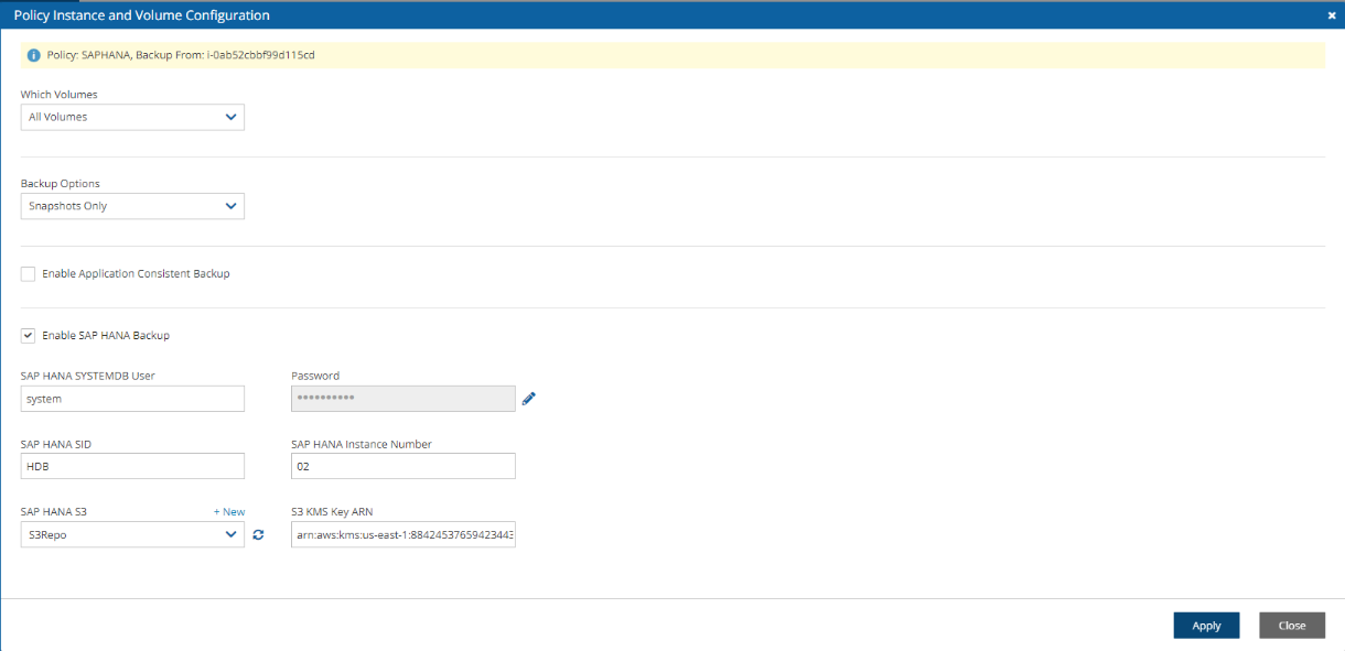 Currently, AWS only supports one backup of an SAP Hana database in parallel. For the time being, N2W allows adding an SAP Hana database to only one Policy.