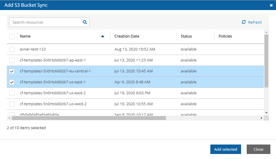 Choose one or more buckets, and select Add selected. Selected buckets are removed from the table.