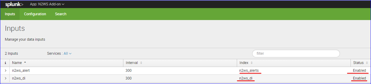 Go to splunk > App N2WS Add-on > Configuration.