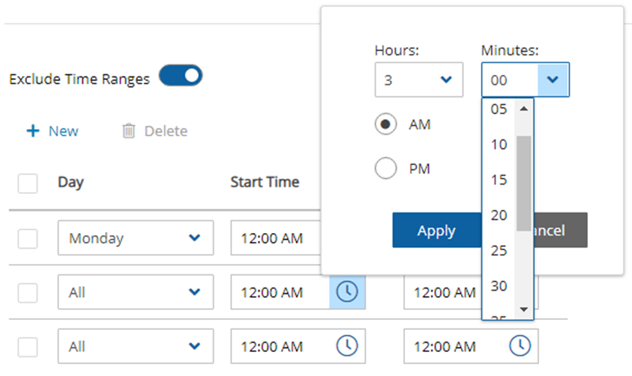To exclude time ranges within the defined schedule, turn on the Exclude Time Ranges toggle. See section 4.1.4.